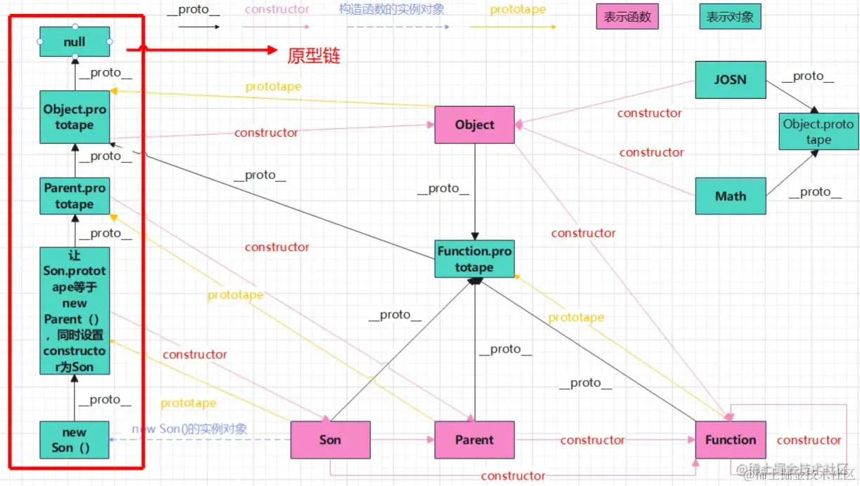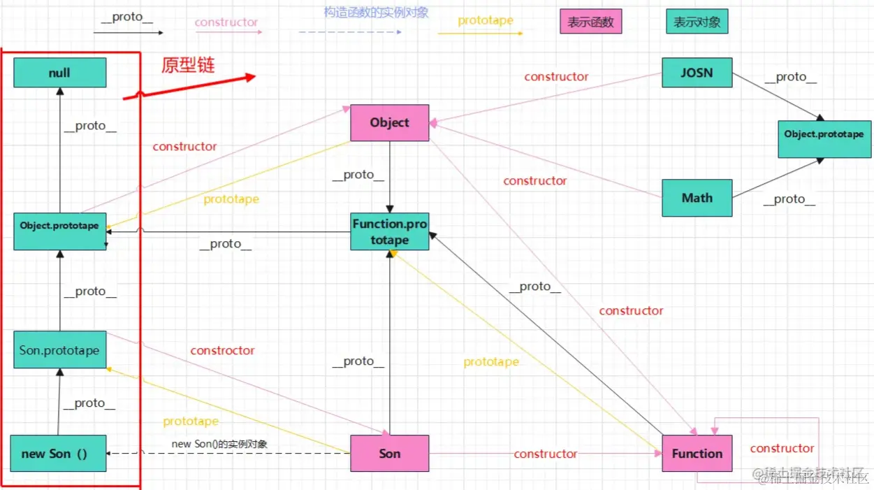 箭头指向它们的方向,上述关系(–proto–,constructor,prototape)都在例子中讲解了,就不再赘述,这里关注的是原型链。(备注:本图的JOSN和Math对象不好画在图的左边,因此又画了一个Object.prototape原型对象在右边。)我们看Son的实例对象,为了方便,我写一个var son=new Son()。通过son.–proto–,可以得到Son.prorotape。如果继续通过链式,即son.–proto–.–proto–可以得到Object.prototape。我们已经知道了,son.–proto–就是为Son.prorotape,那么我们通过Son.prorotape.–proto–也可以得到Object.prototape。也就是说,–proto–能够让我们顺藤摸瓜,一直向上查找,这就是原型链(图中已经用红色大边框包裹起来了)。当我们son.–proto–.–proto–.–proto–(相当于Object.prototape–proto–,也相当于Son.prorotape.–proto–.–proto–)时,得到null,这说明,原型链是有终点的。
