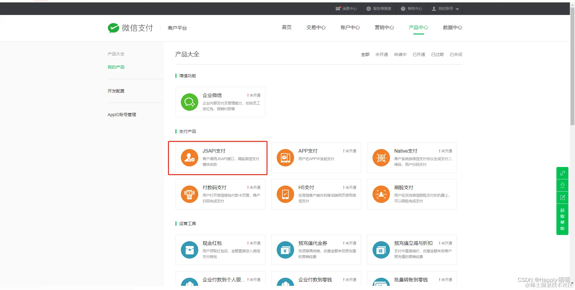 点击产品中心 – 我的产品 ,点击申请JSAPI支付。