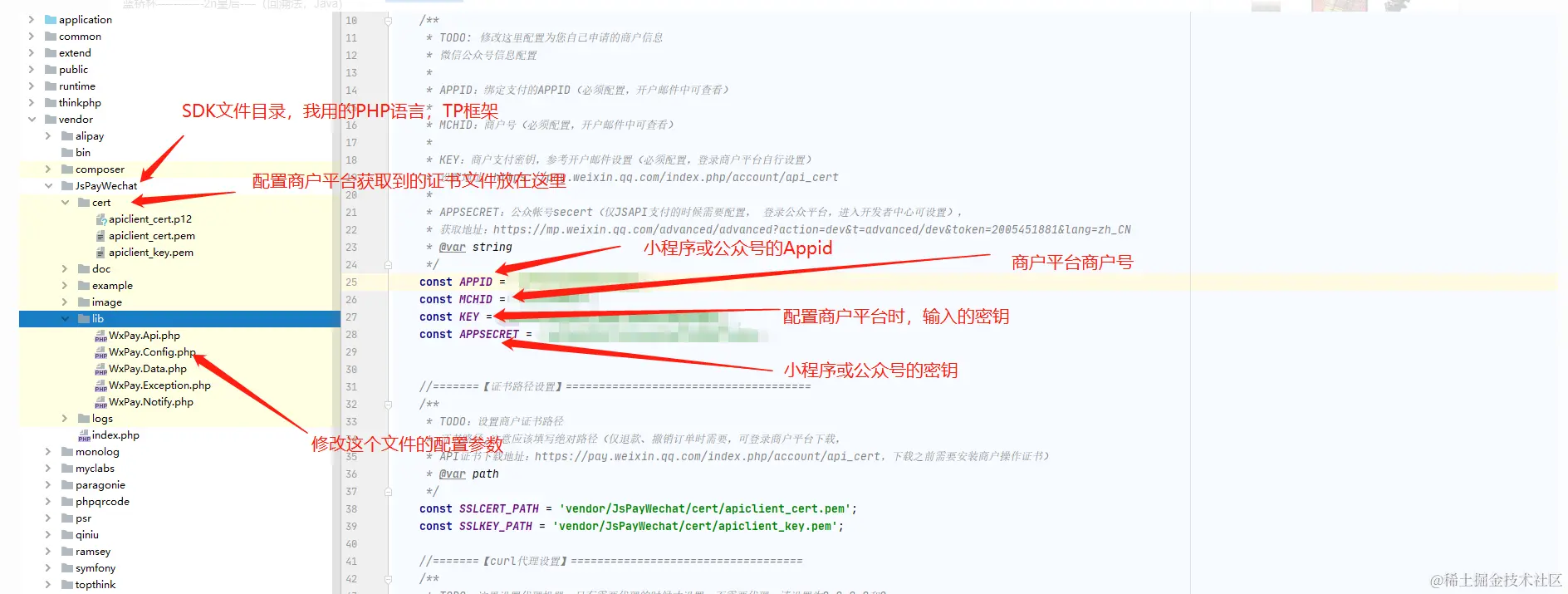 后端开发由于编程语言不同,此处以PHP开发为例。介绍一下统一下单接口和退款接口的调用;首先要下载一下官方提供的SDK引入项目中。然后将之前获取到的证书文件也放入程序目录中。由于各个版本SDK不同,此处只记录自己用的配置流程(不喜勿喷)。