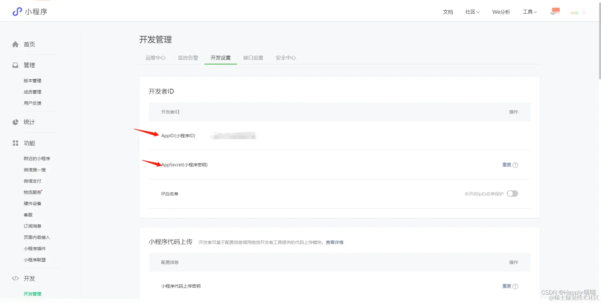 然后点击开发 – 开发管理 – 开发设置,拿到小程序的appid和appsecret(开发密钥)。