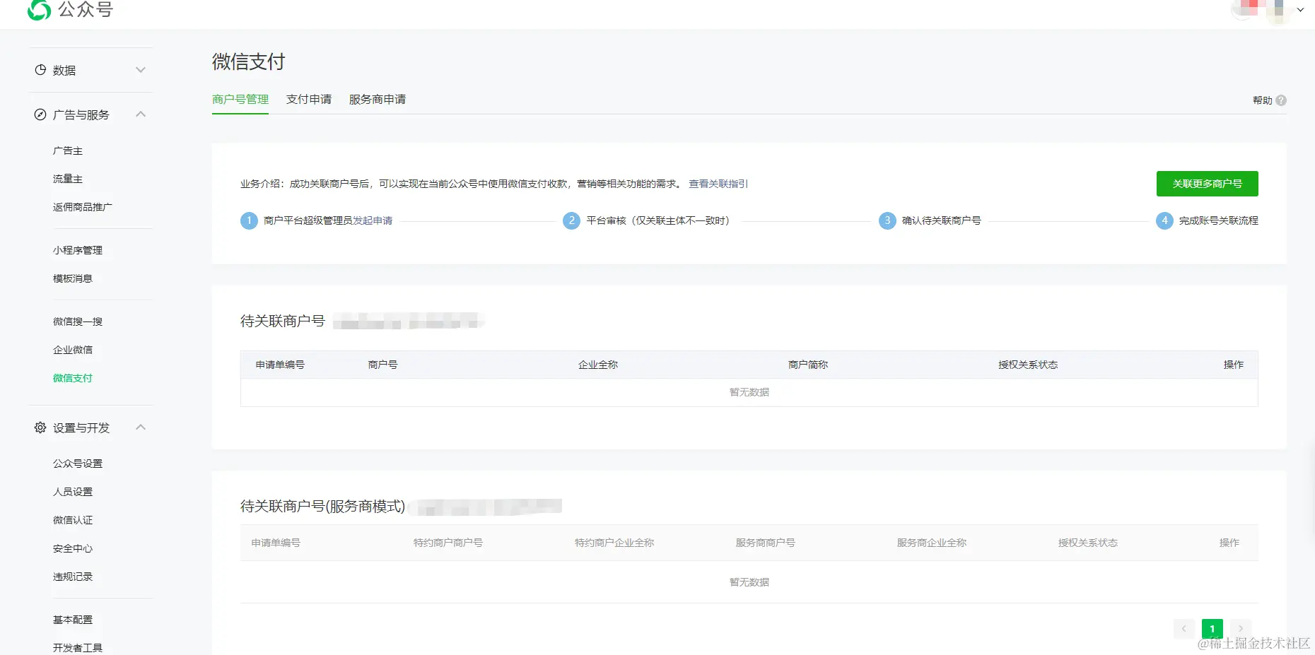 如果是微信公众号程序接入微信支付,需要登录微信公众号,点击广告与服务 – 微信支付关联一下注册好的微信商户平台(此处一般都是客户自己完成,不介绍。也就是说只有关联过的微信商户才能在公众号中拉起支付。