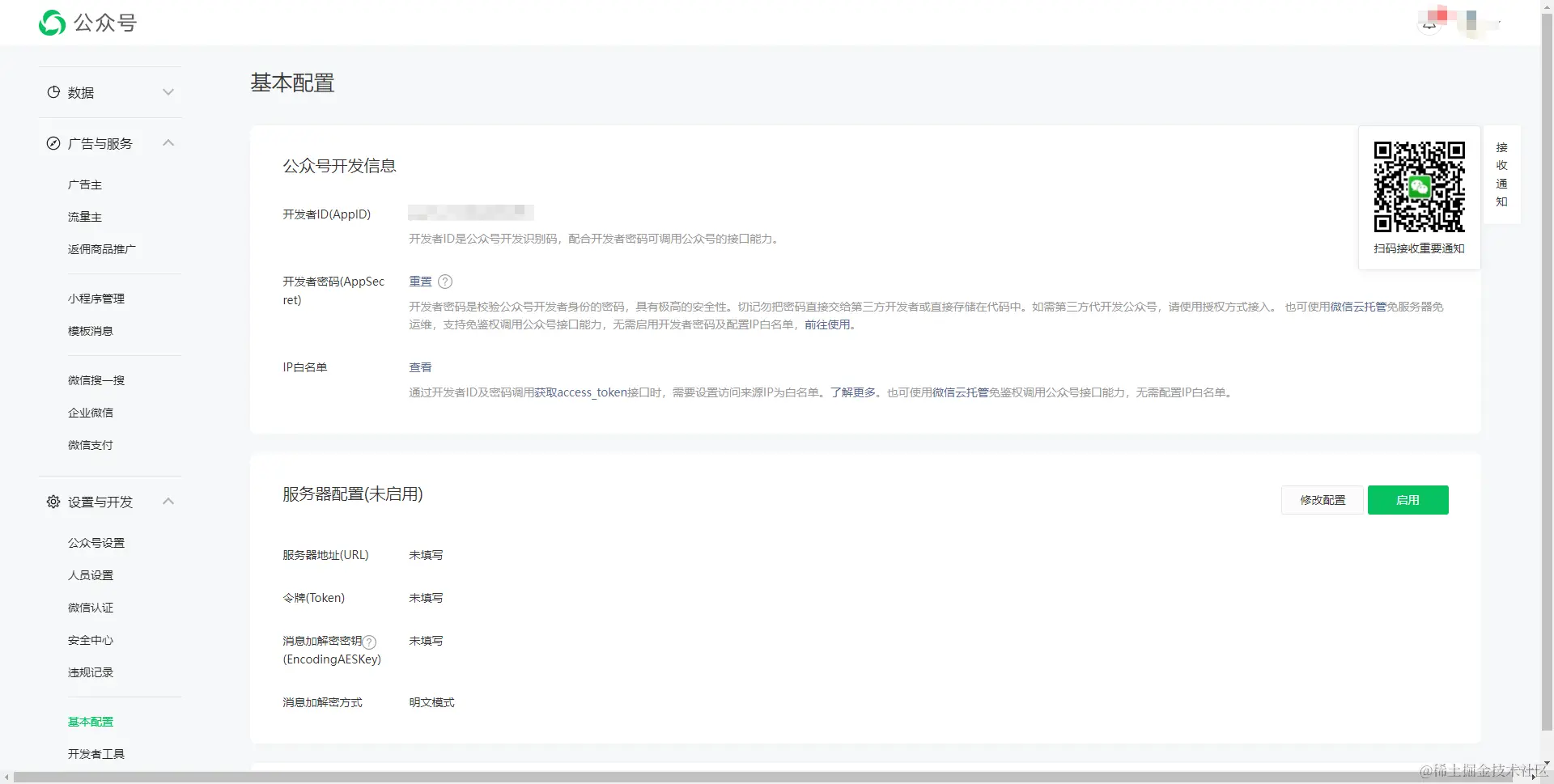 然后点击设置与开发 – 基本配置 ,拿到公众号的appid和appsecret(开发密钥)。