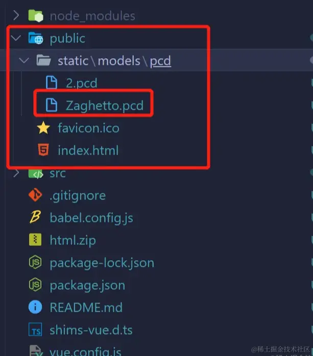 首先创建一个vue3.x,的项目,然后需要先有一个 .pcd三维模型文件,如果有的话,将三维点云文件放在如下图的文件夹里,如果没有的话,百度云盘(链接:pan.baidu.com/s/1TM2gKCep… )