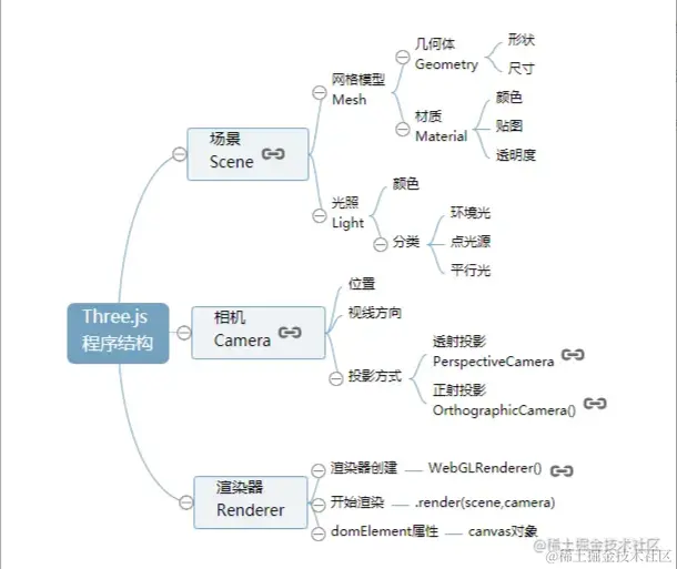 - 渲染器-renderer 就好比刚刚物色的那块风水宝地 ,我什么都准备好了总要找个合适的地方进行拍摄嘛 ,这里就是通过渲染器来创建一个自定义大小的拍摄地点 渲染器中文文档