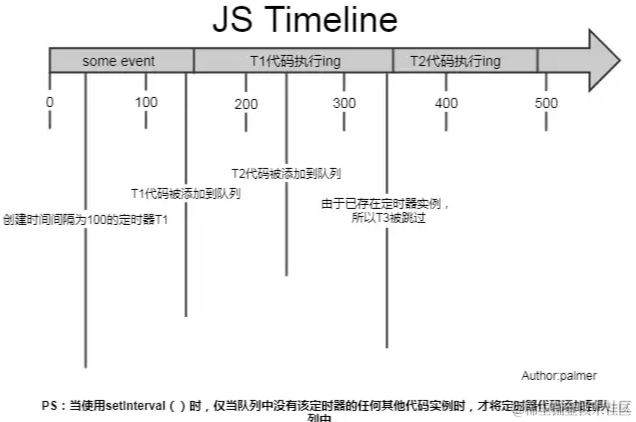 上图可见,setInterval每隔100ms往队列中添加一个事件;100ms后,添加T1定时器代码至队列中,主线程中还有任务在执行,所以等待,some event执行结束后执行T1定时器代码;又过了100ms,T2定时器被添加到队列中,主线程还在执行T1代码,所以等待;又过了100ms,理论上又要往队列里推一个定时器代码,但由于此时T2还在队列中,所以T3不会被添加,结果就是此时被跳过;这里我们可以看到,T1定时器执行结束后马上执行了T2代码,所以并没有达到定时器的效果。