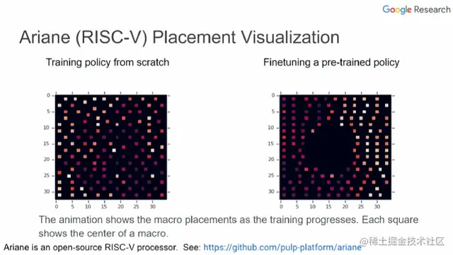 上图中,左边和右边分别展示了从头训练的策略和经过微调预训练策略的芯片布局过程。每个小方块表示一个宏的中心,空白部分表示为标准单元预留的位置。可以看到,右边从一开始就将宏放在边缘,将大片中间区域留空。而左边则要经过很多次迭代才能形成这样的格局。