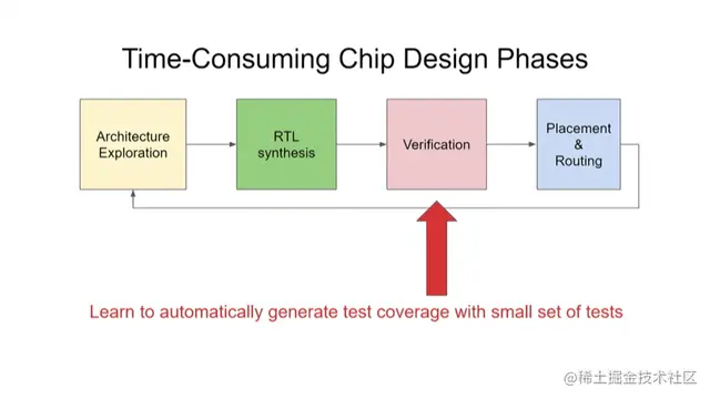 接下来是芯片设计的验证阶段。我们希望用较少的测试次数覆盖多个测试项目。验证是阻碍芯片设计提速的主要瓶颈。据估计,芯片设计过程中,80%的工作量在于验证,而设计本身仅占20%。因此,验证技术的任何一点进步都会产生重大作用。