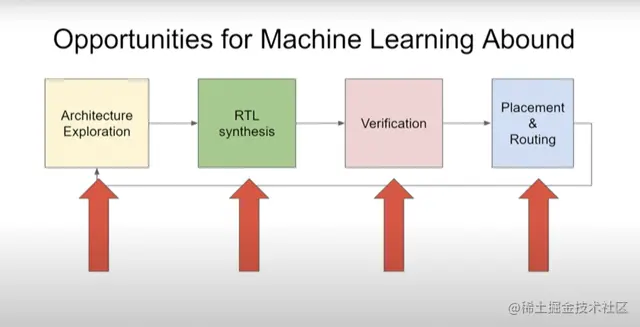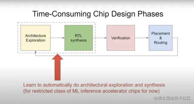 他的演讲重点在于Google如何使用机器学习优化芯片设计流程,这主要包括架构搜索和RTL综合、验证、布局与布线(Placement and routing)三大阶段。在架构搜索阶段,Google提出了FAST架构自动优化硬件加速器的设计,而在验证阶段,他们认为使用深度表示学习可提升验证效率,在布局与布线阶段,则主要采用了强化学习技术进行优化。