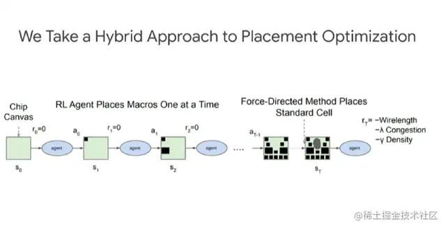 如上图所示,布局优化采取的是混合方式。强化学习智能体每次放置宏(macro),然后通过力导向方法(force-directed method)放置标准单元。