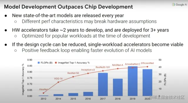 但问题是,如果你在2016年想要尝试设计一个机器学习加速器,那么你需要两年时间来设计芯片,而设计出来的芯片三年后就会被淘汰。你在2016年做的决定将会影响计算,要保证在2018年-2021年高效运行,这真的很难。比如在2016年推出了Inception-v3模型,但此后计算机视觉模型又有四方面的大改进。