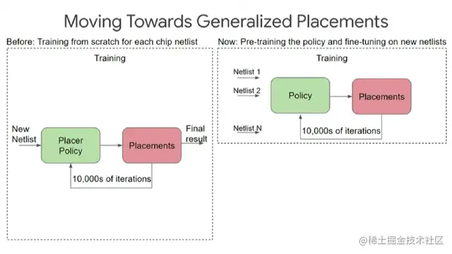 为了实现这个目标,首先,我们运用强化学习算法优化某个芯片设计块的布局,期间需要经历上万次迭代;然后,重复前一步骤,在多个不同的设计块上预训练出一套布局规则,最终让算法在面对前所未见的新设计块时也能给出布局方案。