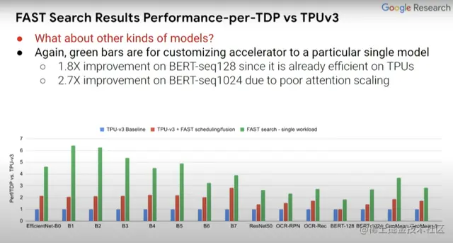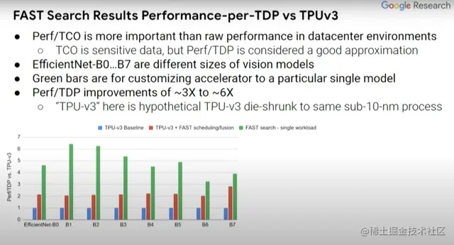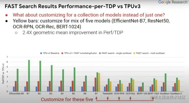 红条和蓝条表示的内容是一致的,但一些探索过的编译器优化不一定在蓝条中得以体现,而这里的绿条则表示的是为单一计算机视觉模型定制的假定型设计。EfficientNet-B0...B7表示相关但规模不同的计算机视觉模型。与蓝条baseline相比,(绿条的)Perf/TDP的改进大约在3到6倍之间。