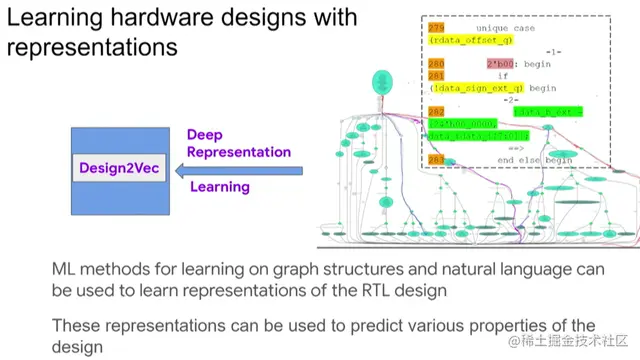 当然,如何将这种方法应用到实际芯片设计中将是另外一个重要话题。用RTL生成图表示之后,我们在图神经网络中运用一种叫Design2Vec的技术进行深度表示学习,从而帮助我们作出预测。