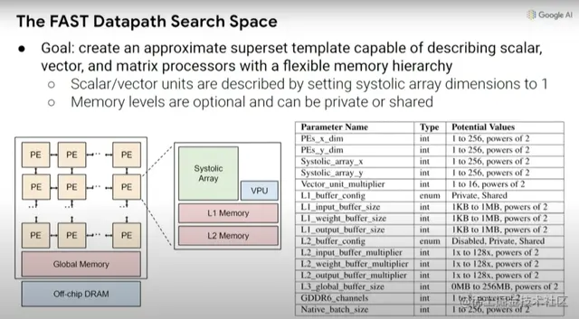 根本上说,我们在机器学习加速器中可能做出的设计决策创建了一种更高级别的元搜索空间,因此,可以探索乘法的脉冲列阵(systolic array)在一维或二维情况下的大小,以及不同的缓存大小等等。
