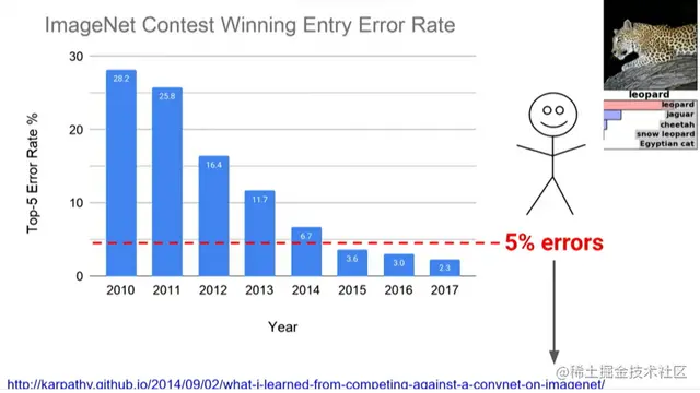 当时的斯坦福大学研究生Andrej Karpathy正在帮助运营ImageNet比赛,他想知道如果人工识别这项艰难的任务,错误率会是多少。在上千个类别中有40种狗,你必须能够看着一张照片说:“哦,那是一只罗威纳犬,不是一只大力金刚犬,或者其他品种的狗。” 经过一百个小时的训练,他将错误率降到了5%。