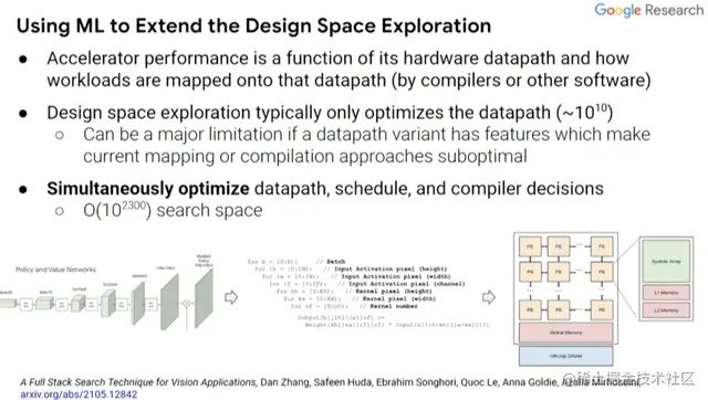 实际上,我们可以使用机器学习来探索设计空间。有两个因素影响加速器性能,一是设计中内置的硬件数据通道,二是工作负载如何通过编译器而不是更高级别的软件映射到该数据通道。通常,设计空间探索实际上只考虑当前编译器优化的数据通道,而不是协同设计的编译器优化和优化数据通道时可能会做的事。