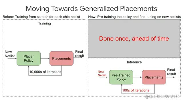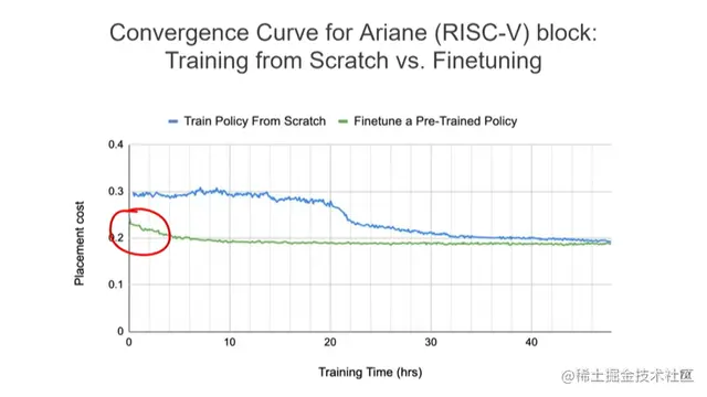 最令我感到兴奋的是圈红部分。调优预训练策略在短时间内就可实现相当不错的布局,这种实现就是我所说的,在一两秒内完成芯片设计的布局。