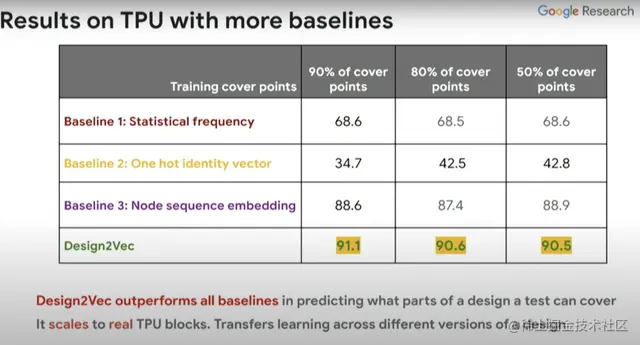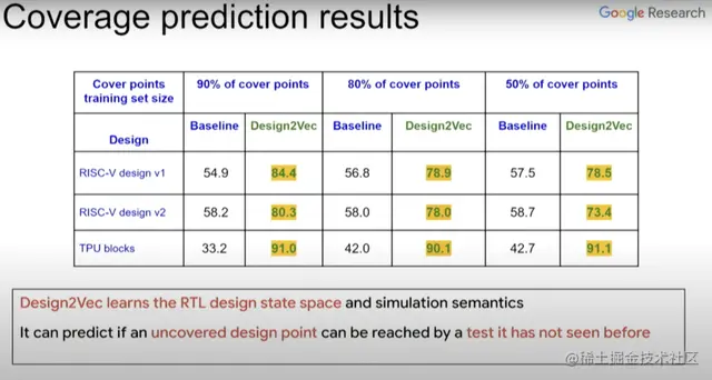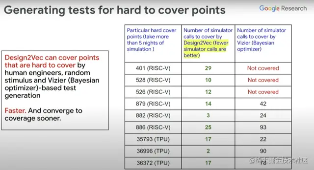 上图右边这一列是贝叶斯优化器覆盖的不同测试点、覆盖点所需的模拟器调用数(simulator calls),中间一列是使用Design2Vec所需的模拟器调用数。从中可以看到,为覆盖这些有挑战性的覆盖点,Design2Vec生成的测试要少于贝叶斯优化器。所以Design2Vec非常好,相比之下它更快,能聚焦覆盖范围,还能节省在运行计算模拟器(本身很昂贵)上的开销。