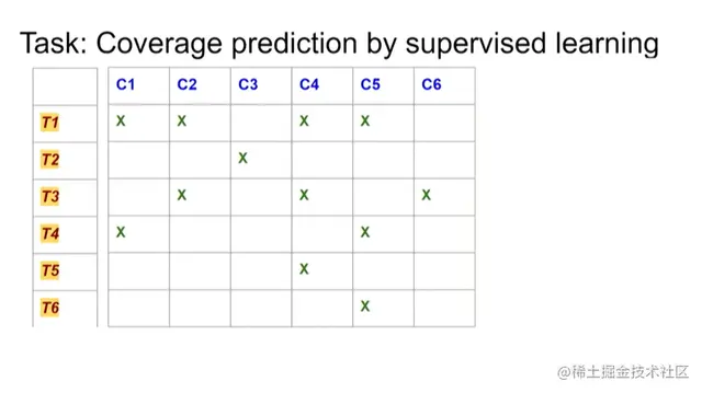 后来我们发现,可以把这个问题转化为一个监督学习问题。如果之前进行了一系列测试,并知道这些测试覆盖哪些测试点,就可以将这些数据用作监督学习中的训练数据。