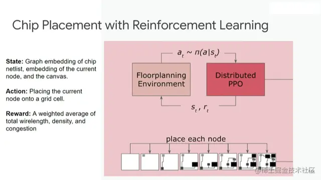 利用强化学习进行芯片布局的步骤如下:首先从空白底座开始,运用分布式PPO算法(强化学习的常用算法)进行设计,然后完成每个节点的布局放置,最后进行评估。