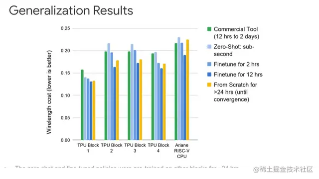 上图展示了更详细的不同设计的情况。Y轴表示线长成本(越低越好)。绿色表示使用商业工具的线长成本,可以看到,从浅蓝色(零次布局)→蓝色(2小时微调)→深蓝色(12小时微调),线长成本越来越低。深蓝色一直比黄色的线长成本要低,因为通过12小时的微调能从其他设计中学到最佳布局。