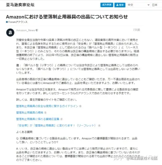 亚马逊日本站发布公告称,随看日本《劳动安全卫生法施行条例》第13条第3项及第28项的修改,建筑业等高 空作业中用于防止因坠机而产生危险的"安全带"被停用,改为“防坠落装备"。