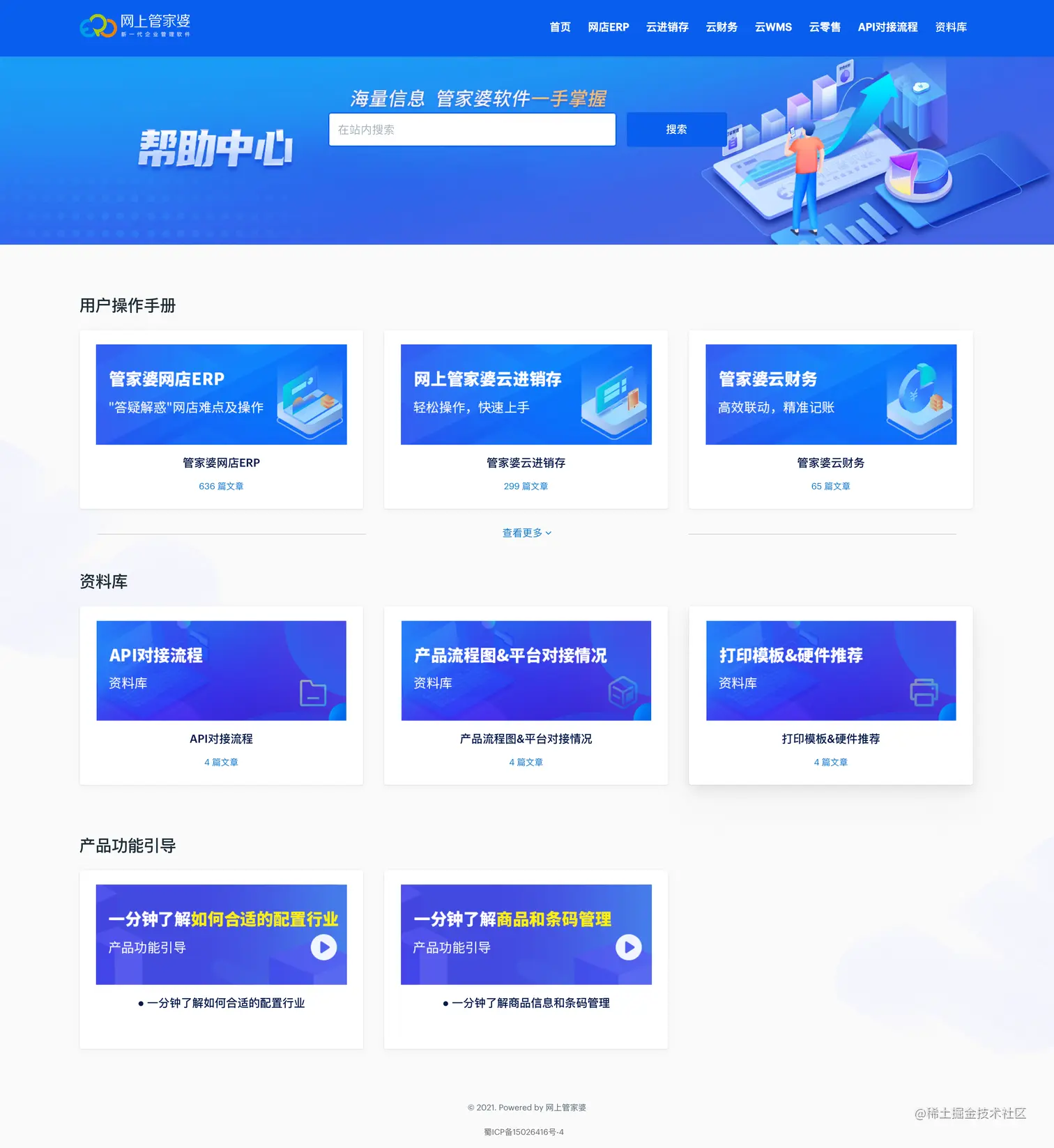 分为三个大板块:用户操作手册、资料库、产品功能引导,每个分类下面进行相应的栏目分类,相应的功能导航一目了然。