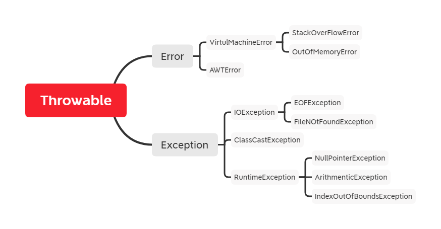 Error 一般表示编译时或者系统错误,例如:Virtual MachineError(虚拟机运行错误),StackOverflowError:栈溢出错误、OutOfMemoryError:内存不足错误等。此类错误开发者无法处理且不可恢复,JVM 将终止线程,因此不应该实现任何新的 Error 子类。