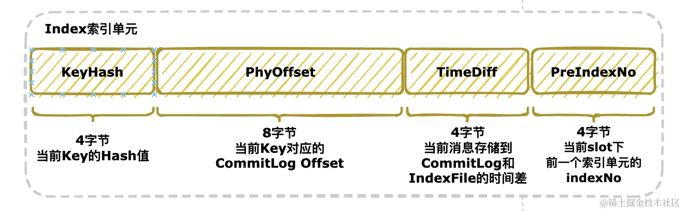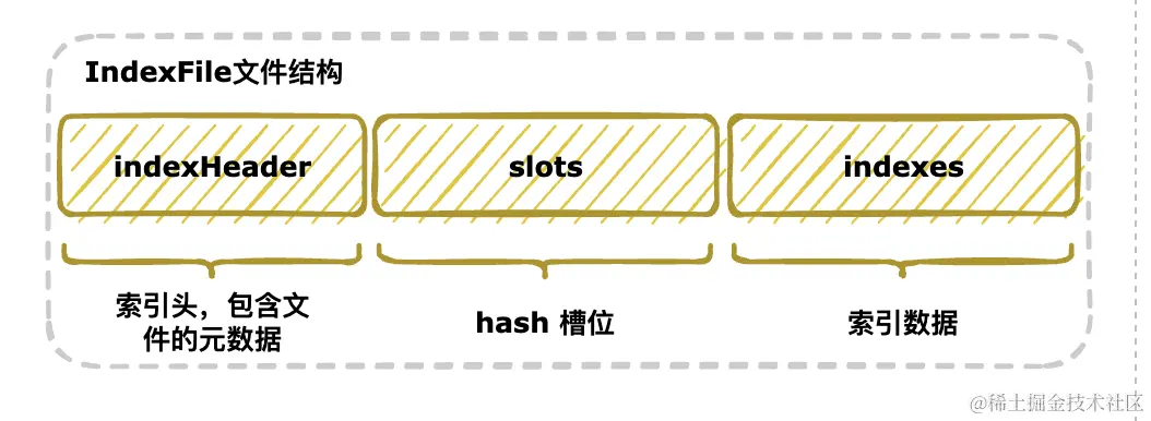 IndexFile 的底层存储设计为在文件系统中实现 HashMap 结构,所以它的结构是 Hash 槽与 Hash 冲突的链表结构,但是具体落地时会把每个 slot 槽挂载的 index 索引单元都存放到 indexes 区中。