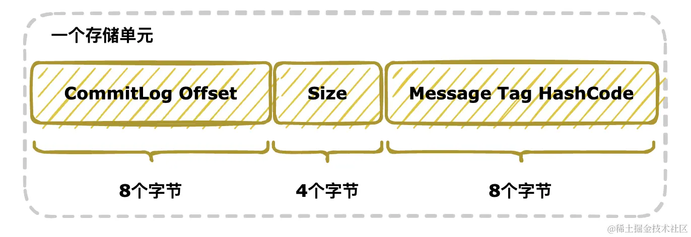 ConsumeQueue 文件存储了CommitLog 文件中的偏移量、消息长度、消息 Tag 的 hashcode 值。可以看到 ConsumeQueue 文件不存储消息的内容,它的定位是基于 Topic 的 CommitLog 索引文件!