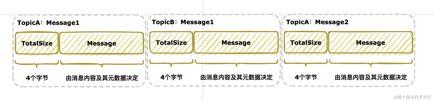 CommitLog 文件存储消息内容及消息总长度,其中消息总长度固定 4 个字节。