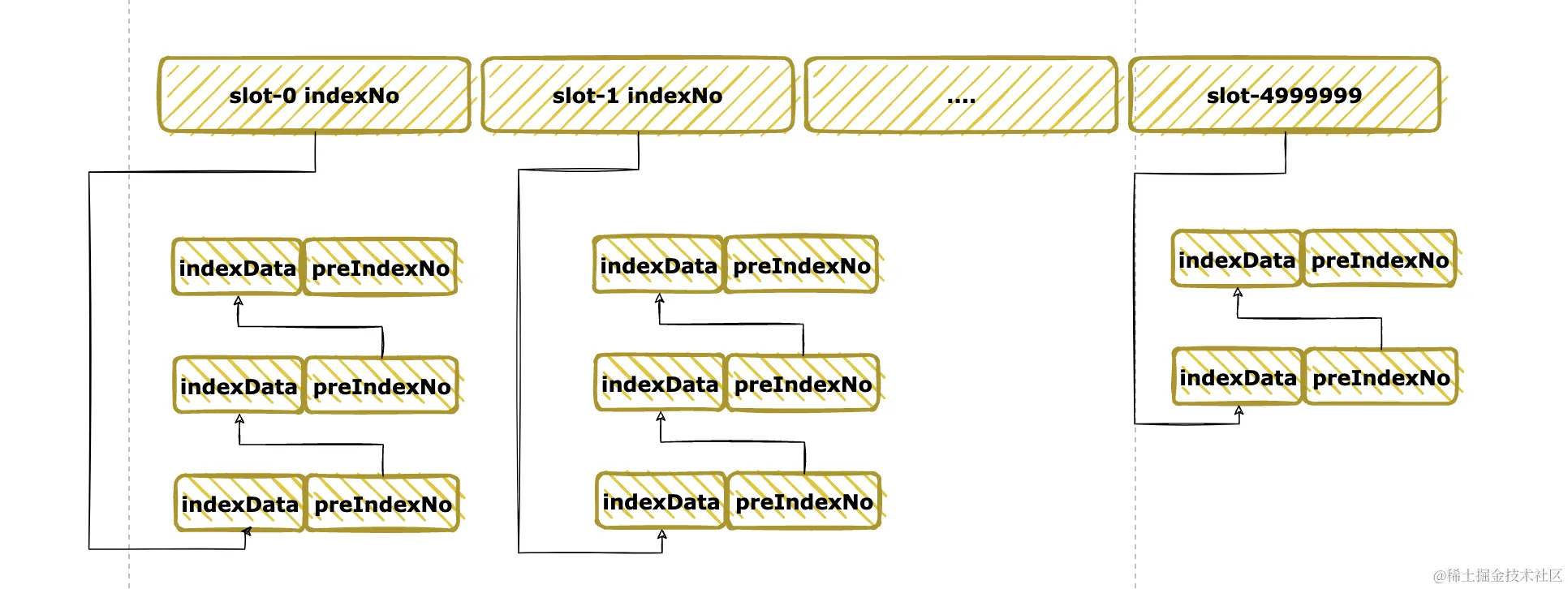 - 每一个 hash slot 都有一个 indexNo,指向链表中最后(最新)的一个索引单元。