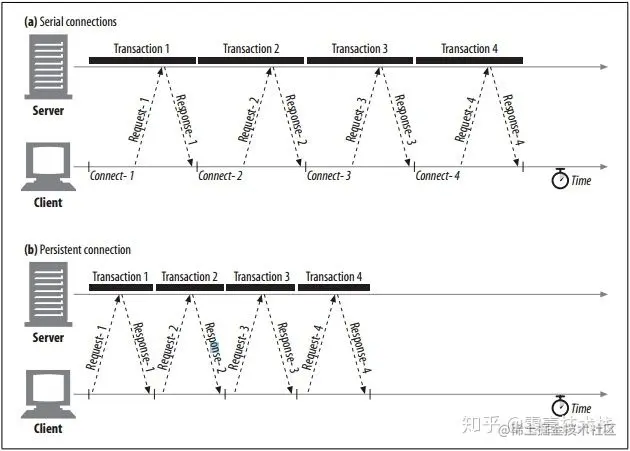 在实际的应用中,客户端往往会发出一系列请求,接着服务器端对每个请求进行响应。对于这些请求|响应,如果每次都经过一个单独的TCP连接发送,称为非持久连接。反之,如果每次都经过相同的TCP连接进行发送,称为持久连接。
