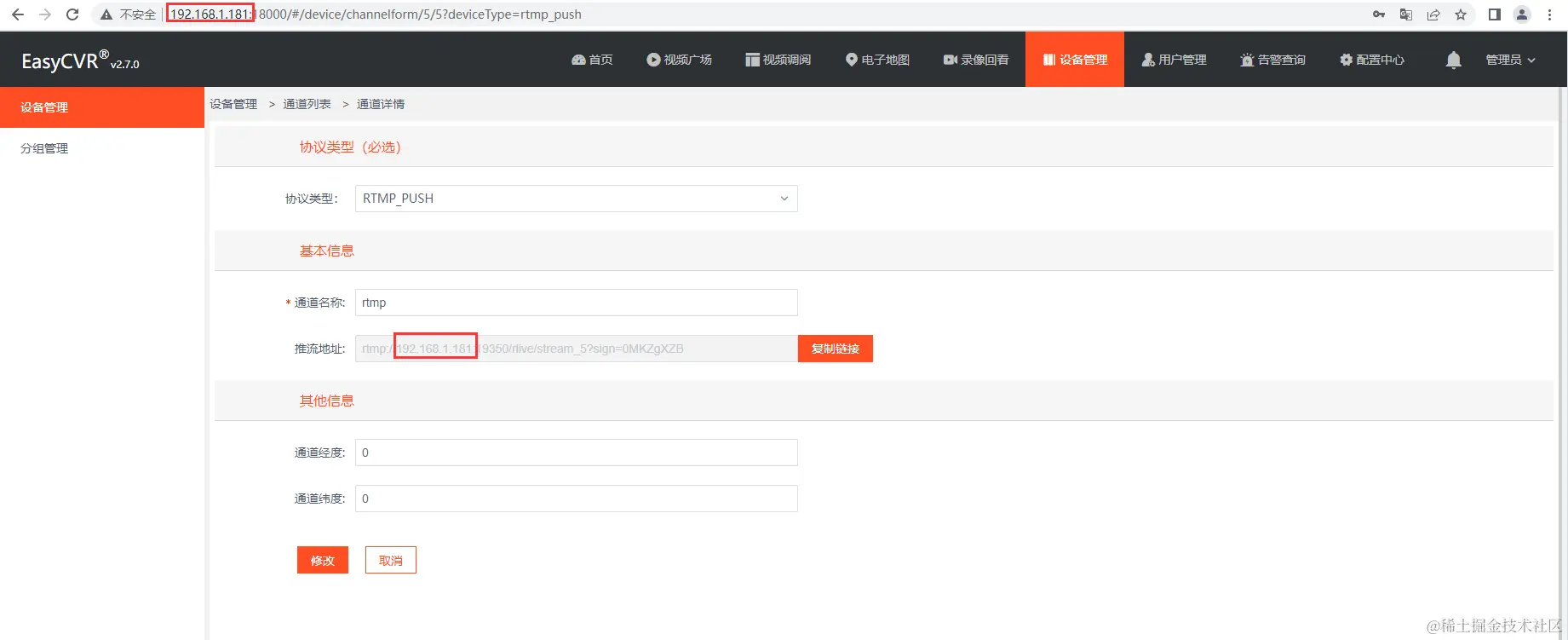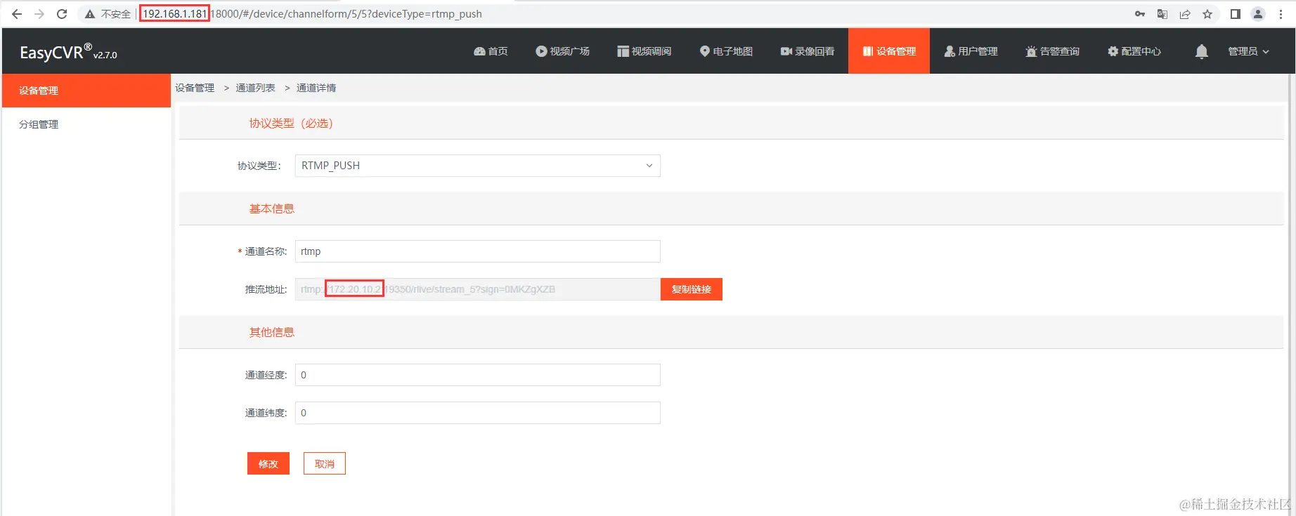 我们在使用RTMP_PUSH协议时,添加通道后,可以看到RTMP的连接地址,但有时候会发现,这个连接地址的IP地址与该服务器的IP不一致,这就会导致设备无法推流到正确的服务器上。那么,这个问题该如何解决呢?