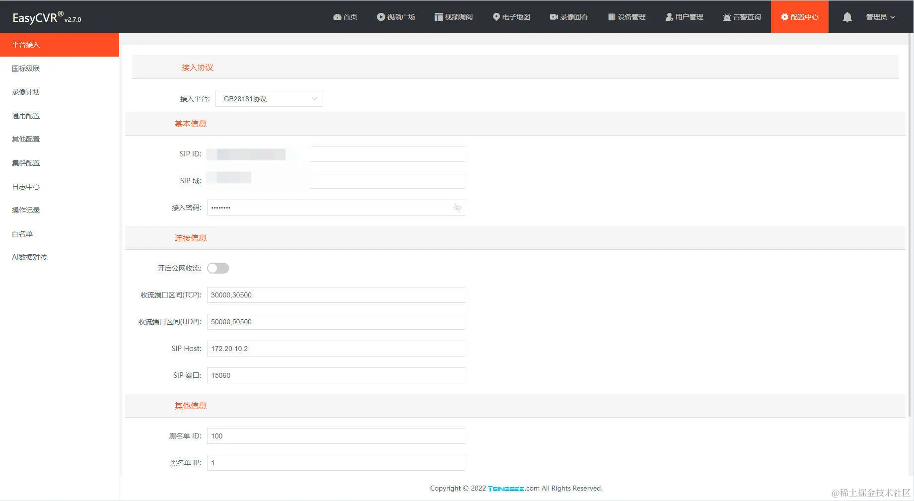 点击【配置中心】—【平台接入】,在接入协议为GB28181协议中,找到SIP Host的输入框,我们会发现,这个地方的IP地址与上面的推流地址是一样的,而且这个地址是可变更的。那么我们可以修改这个IP,然后再去通道详情里查看下IP是否发生了变化。