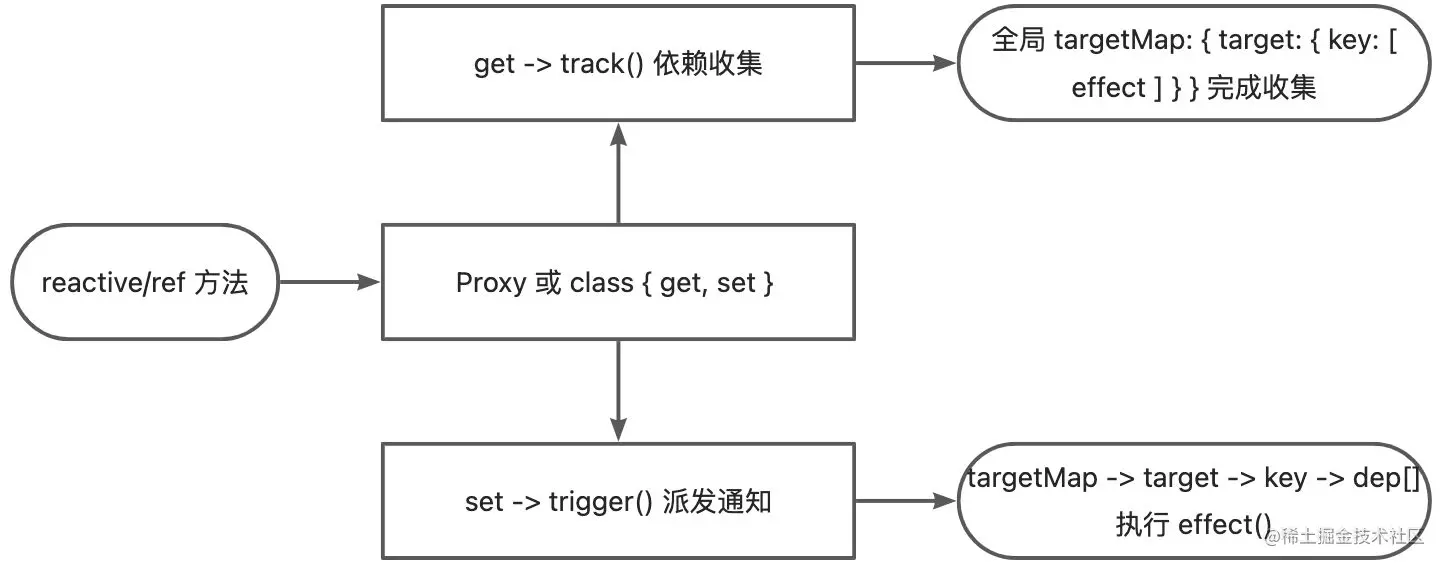- class RefImpl{} 类内部定义了对 value 属性且对 getter/setter 访问拦截。这就是为什么需要以 ref.value 形式读取/修改了。且 getter/setter 拦截对应着 track/trigger()