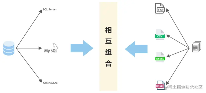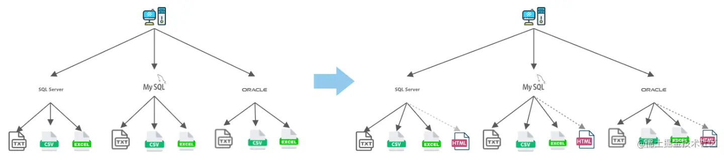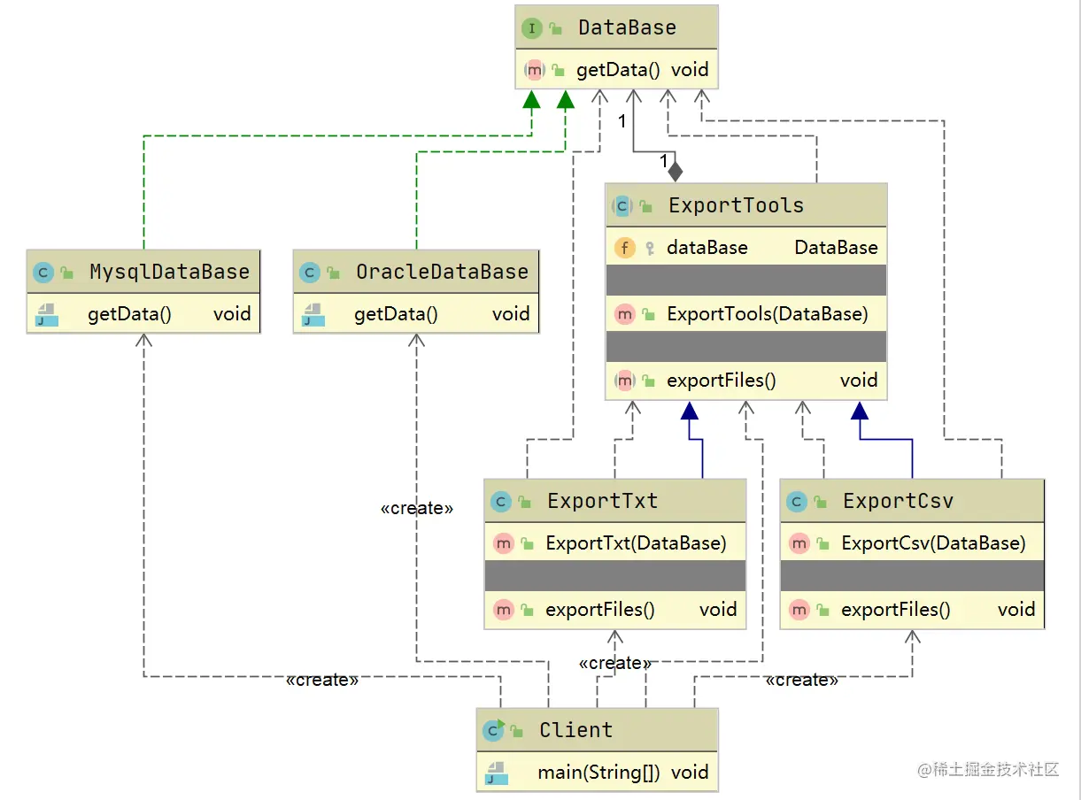 我们公司要开发一款软件,具体需求是从oracle、mysql、sqlserver等多种数据库导出txt、csv、excel等格式的数据文件。比如说数据库类型有3种,导出文件格式有3种,分别需要实现 3*3=9个子类,如果再拓展一个导出文件格式,类的个数会成倍增加。