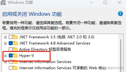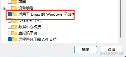 一、在“启用或关闭Windows功能”中选中“Hyper-V”和“适用于Linux的Windows子系统”,启用WSL。