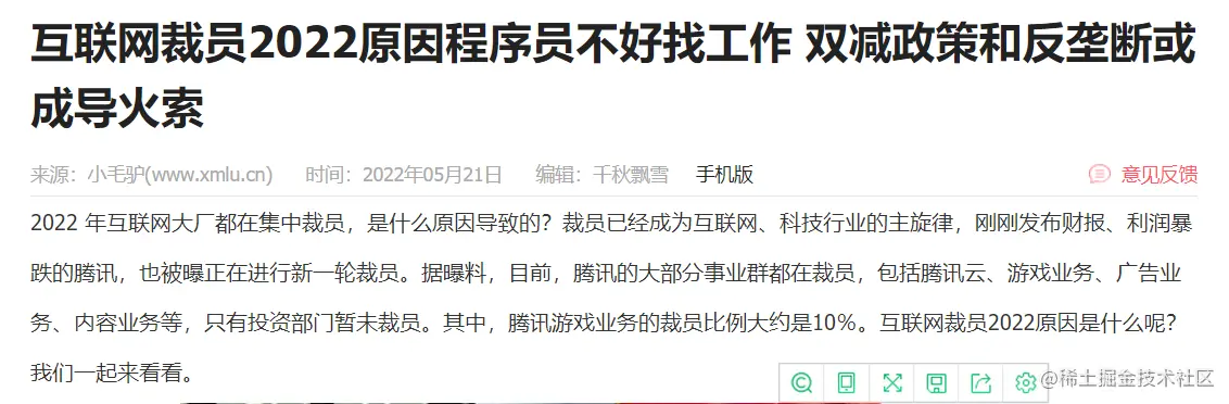 上面截图中的观点认为程序员工作不好找的导火索或许是双减和反垄断政策,主要是从互联网个体企业的人员裁剪方面来看的。