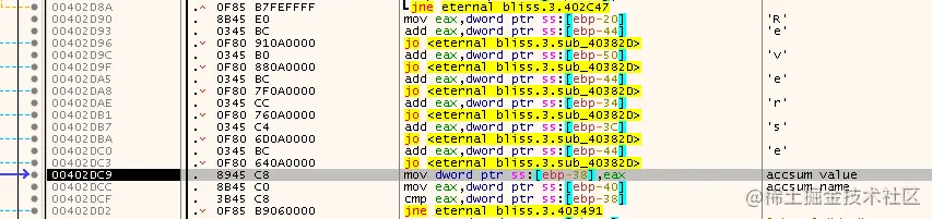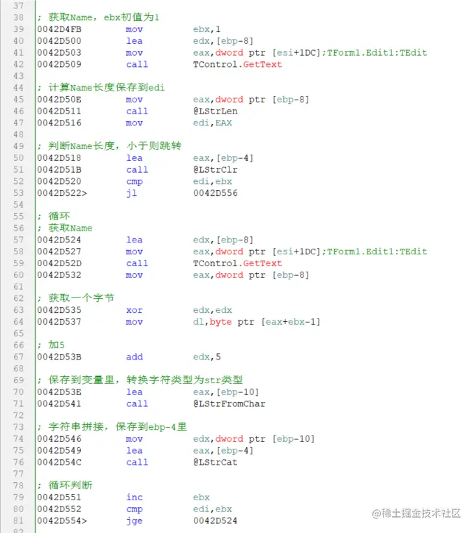 再往下就是循环了,一个jmp跳转下去,然后又跳转上来,直接看循环的关键内容吧:
