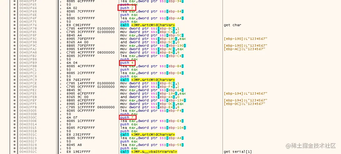 首先输入1234567进行调试,VB的反汇编很恶心就是,很长一段代码,只有几句是跟代码逻辑相关的内容,大部分都是干扰