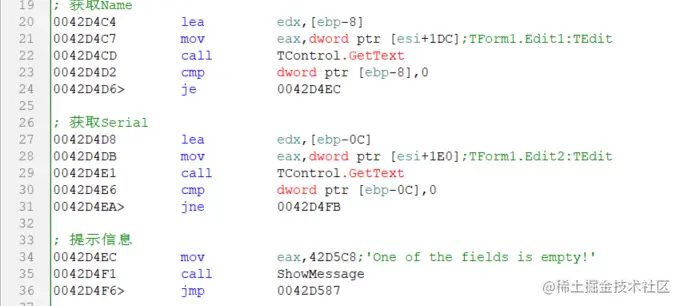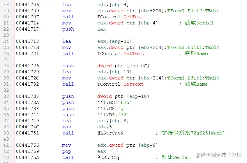 loc_004020CA: var_44 = Form1.Text2.Text // Name编辑框的内容