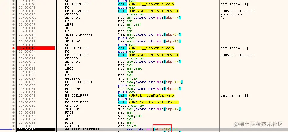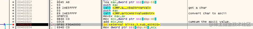 loc_00402170: var_8008 = Asc(CStr(Mid(var_44, CLng(var_24), 1))) // 取一个字节变成ASCII码
