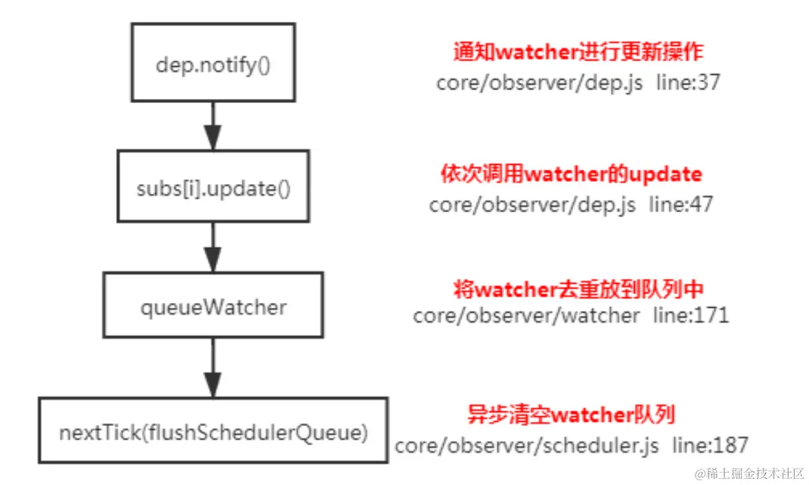 Vue确实可以在数据变化时,响应式系统可以立刻得知。但是如果给每个属性都添加watcher用于更新的话,会产生大量的watcher从而降低性能 - 而且粒度过细也得导致更新不准确的问题,所以