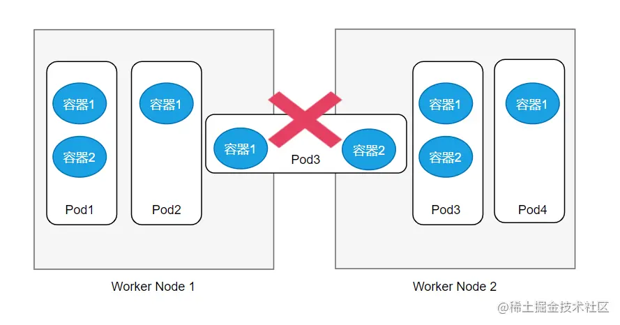 Pod是Kubernetes的基本构建单元,通常我们不会单独地对容器进行部署,而是对容器所在的Pod进行部署、操作。Pod可以包含一个或者多个容器,在实际使用过程中,一个Pod只包含一个容器是比较常见的,而且是最常用的应用方式,除非特别需要,比如应用之间耦合度和依赖比较高,一般都不推荐使用多容器Pod的方式。如果一个Pod包含多个容器,那么这些容器肯定都是在一个工作节点上运行。Pod是不会跨多个工作节点进行部署的,就像下图所展示的一样: