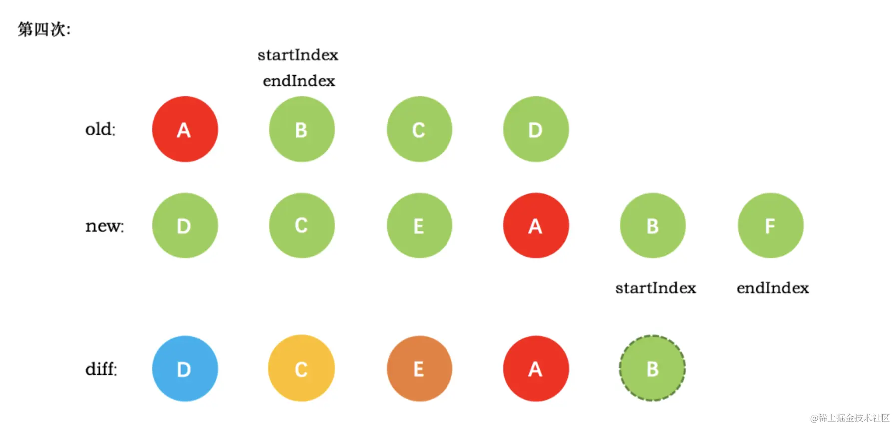 oldCh和newCh各有两个头尾的变量StartIdx和EndIdx,它们的2个变量相互比较,一共有4种比较方式。如果4种比较都没匹配,如果设置了key,就会用key进行比较,在比较的过程中,变量会往中间靠,一旦StartIdx>EndIdx表明oldCh和newCh至少有一个已经遍历完了,就会结束比较,这四种比较方式就是首、尾、旧尾新头、旧头新尾