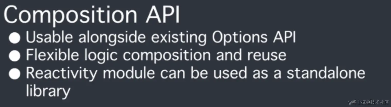 - 由于 Options API 不够灵活的开发方式,使得Vue开发缺乏优雅的方法来在组件间共用代码。