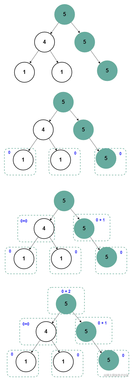 问题已经被简化到,只需要咱们关注一个节点的左子结果,右子结果,以及当前节点的左子是否和自己相等,右子是否和自己相等