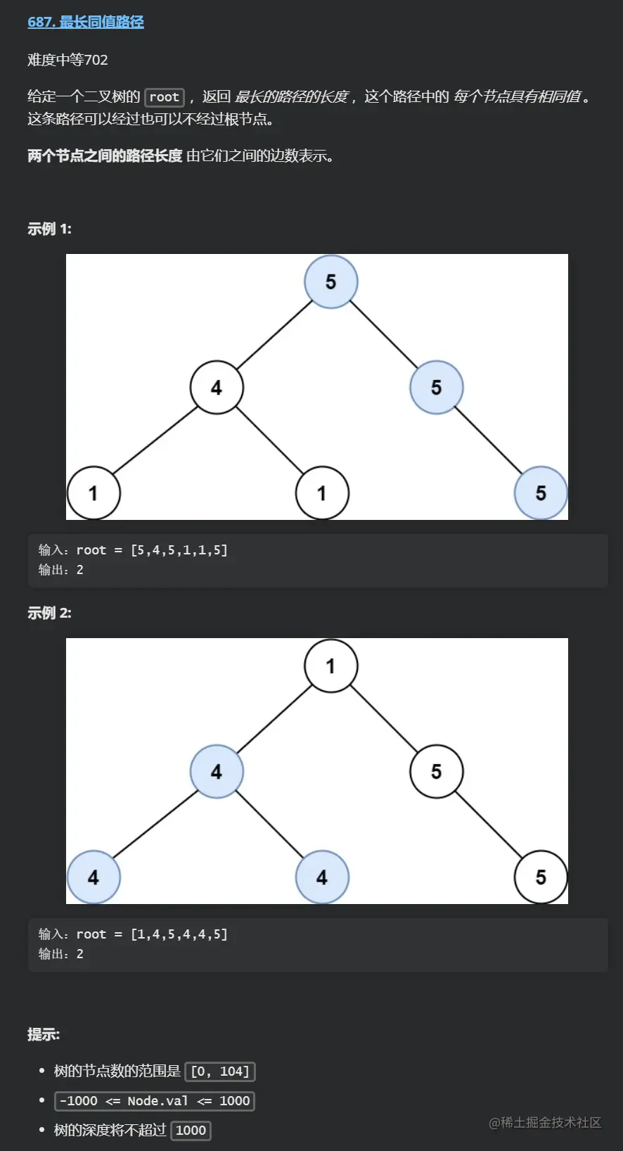 继续咱们的每日一题,继续刷 687. 最长同值路径