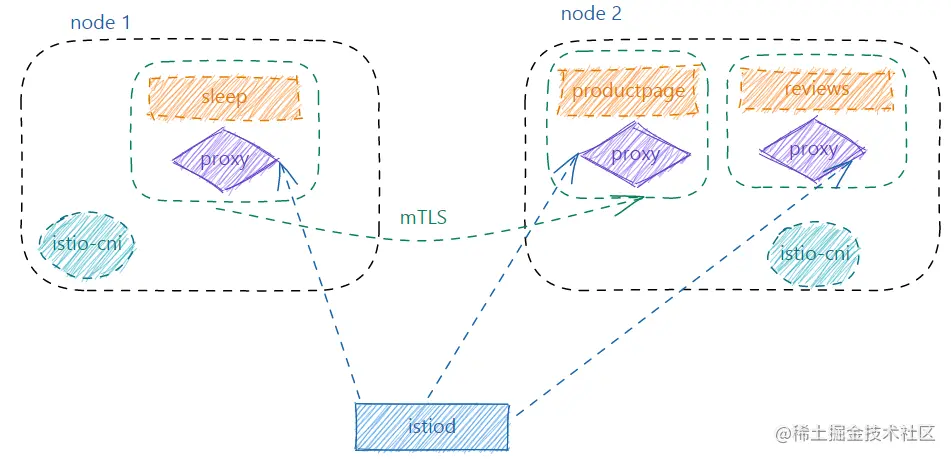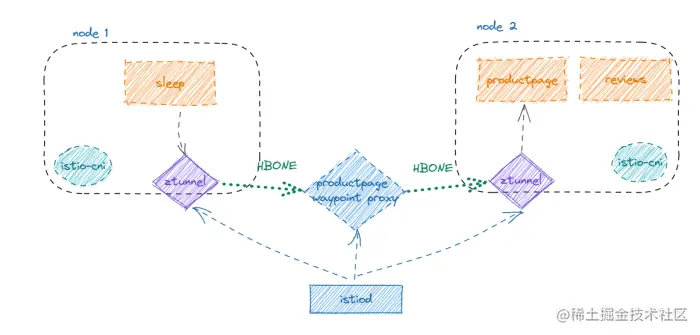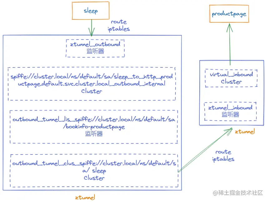 (1) sleep访问productpage的流量被同节点的tunnel以TPROXY(透明代理)方式拦截转发到ztunnel(监听127.0.0.1:15001),使用TPROXY的好处是保留原始的目的地址,ztunnel做转发时必须依赖原始目的地址。
